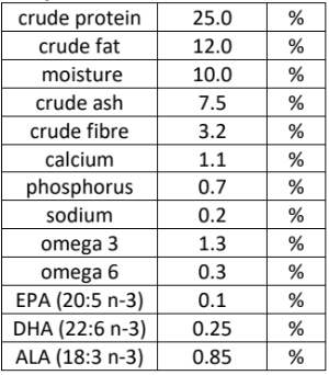 Insect protein (26%), peas, lamb protein (14%), potato starch, coconut oil, linseed (4%),dried apple pulp, hydrolyzed chicken liver, dried raspberries (1%), dried algae (1%, Schizochytriumlimacinum), rapeseed oil.