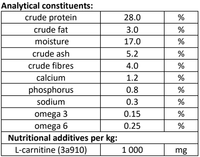 Metabolizable energy: 2 950 kcal/kg