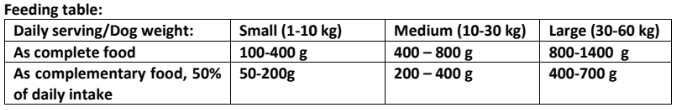 Feeding guide: Brit Fresh offers delicious complete and balanced nutrition with real meat, organs, vegetables, fruits, and herbs from local sources. Serve the can at room temperature. Serving size may vary according to your dog’s activity level and environment. When serving for increased variety and flavour, be sure to reduce the recommended daily serving size of your dog’s regular food accordingly. Fresh water must be available at all times.