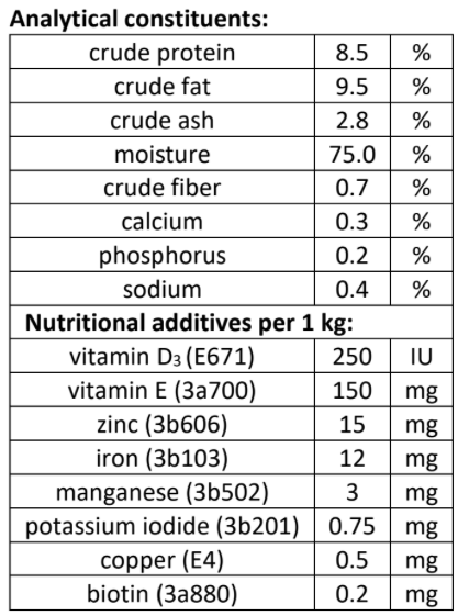 Composition: 68% beef, 10.8% pumpkin, 13% broth, 2% apple, 2% minerals, 1% herbs mix (rosemary, thyme, marigold, dandelion), 1% parsley, 1% salmon oil, 0.5% topinambur, 0.5% linseed, 0.2% algae and chard.