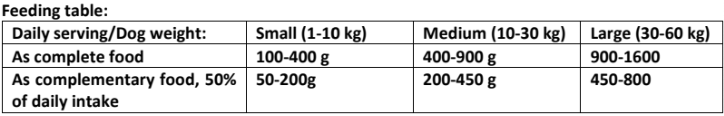 Feeding guide: Brit Fresh offers delicious complete and balanced nutrition with real meat, organs, vegetables,fruits, and herbs from local sources. Serve the can at room temperature. Serving size may vary according to your dog’s activity level and environment. When serving for increased variety and flavour, be sure to reduce the recommended daily serving size of your dog’s regular food accordingly. Fresh water must be available at all times