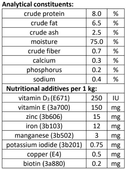 Composition: 48% chicken, 28% turkey, 11% broth, 4.5% sweet potato, 1.3% buckwheat, 2% apple, 2% minerals,1% herbs mix (rosemary, thyme, marigold, dandelion), 1% salmon oil, 0.5% parsley, 0.5% linseed, 0.2% algae and blackcurrant.