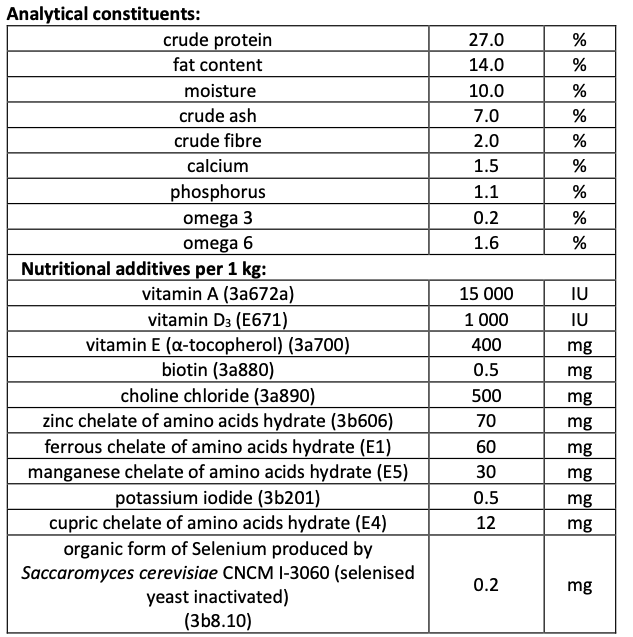 Composition: chicken 45% (dehydrated 25%, deboned 20%), oats, wheat, chicken fat (preserved with mixed tocopherols), corn, apples dried, salmon oil (2%), hydrolyzed chicken liver, brewer ́s yeast, collagen, crustacean shells (a source of glucosamine, 210 mg/kg), cartilage (a source of chondroitin, 150 mg/kg), herbs & fruit (cloves, citrus, rosemary, curcuma, 120 mg/kg), mannan-oligosaccharides (120 mg/kg), fructo- oligosaccharides (90 mg/kg), Mojave yucca (90 mg/kg), chamomile dried (80 mg/kg), green-lipped mussels (a source of glycosaminoglycans, 50 mg/kg), blueberries dried (50 mg/kg).