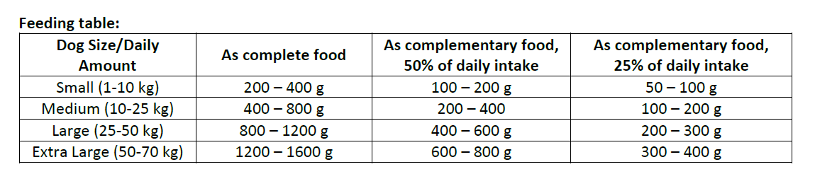Feeding guide: The daily nutritional requirements of your dog may vary according to environment, size, age, and activity level. Serve the can at room temperature. When serving for increased variety and flavour, be sure to reduce the recommended daily serving size of your dog’s regular food accordingly. Fresh water must be available at all times. Store in a cool and dry place. One the can is opened, keep in the fridge, and use in 3 days. Expiry date and batch on the can bottom.