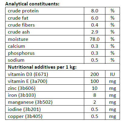 Analytical constituents: crude protein 8.0 %, crude fat 6.0 %, crude fibre 0.4 %, crude ash 2.9 %, moisture 78.0 %, calcium 0.3 %, phosphorus 0.3 %, sodium 0.5 %.