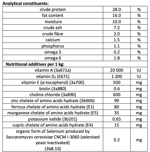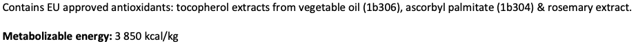 Composition: chicken 45% (dehydrated 25%, deboned 20%), oats, wheat, chicken fat (preserved with mixed tocopherols), corn, salmon oil (2%), apples dried, hydrolyzed chicken liver, brewer ́s yeast, collagen, crustacean shells (a source of glucosamine, 260 mg/kg), cartilage (a source of chondroitin, 180 mg/kg), herbs & fruit (cloves, citrus, rosemary, curcuma, 150 mg/kg), mannan-oligosaccharides (150 mg/kg), fructo-oligosaccharides (100 mg/kg), Mojave yucca (100 mg/kg), chamomile dried (90 mg/kg), green-lipped mussels (a source of glycosaminoglycans, 60 mg/kg), blueberries dried (60 mg/kg).