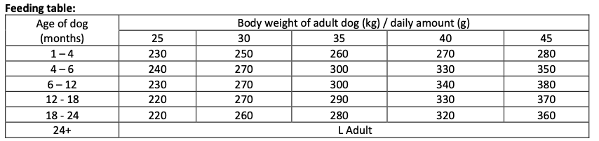 Feeding guide: May be served dry or moistened with lukewarm water. In case of junior dogs - recommended daily food intake shown in a feeding table should be divided into 2-3 equal portions during the day. The recommended daily amount is shown in the feeding table. When serving Brit Premium for first time, use smaller amounts and mix it with previous food and gradually increasing the portion of Brit Premium. Always make sure your dog has plenty of fresh water.