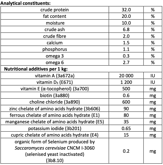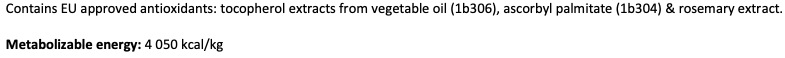 Composition: chicken 55% (dehydrated 30%, deboned 25%), chicken fat (preserved with mixed tocopherols), oats, wheat, salmon oil (2%), corn, apples dried, hydrolyzed chicken liver, brewer ́s yeast, collagen, crustacean shells (a source of glucosamine, 260 mg/kg), cartilage (a source of chondroitin, 180 mg/kg), herbs & fruit (cloves, citrus, rosemary, curcuma, 150 mg/kg), mannan-oligosaccharides (150 mg/kg), fructo-oligosaccharides (100 mg/kg), Mojave yucca (100 mg/kg), chamomile dried (90 mg/kg), green-lipped mussels (a source of glycosaminoglycans, 60 mg/kg), blueberries dried (60 mg/kg).