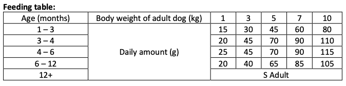 Feeding guide: May be served dry or moistened with lukewarm water. In case of junior dogs - recommended daily food intake shown in a feeding table should be divided into 2-3 equal portions during the day. When serving Brit Premium for first time, use smaller amounts and mix it with previous food and gradually increasing the portion of Brit Premium. Always make sure your dog has plenty of fresh water.