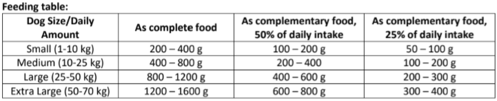 Feeding guide: The daily nutritional requirements of your dog may vary accordingto environment, size, age, and activity level. Serve the can at room temperature. When serving forincreased variety and flavour, be sure to reduce the recommended daily serving size of your dog´sregular food accordingly. Fresh water must be available at all times. Store in a cool and dry place. Oncethe can is opened, keep in the fridge. Expiry date and batch on the can bottom.