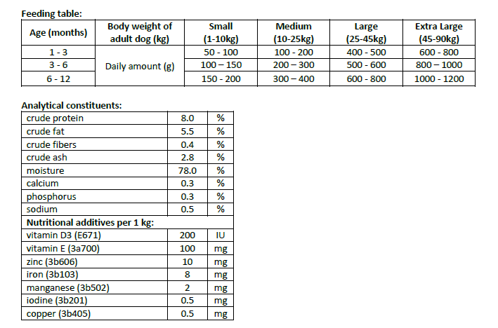 Feeding guide: The daily nutritional requirements of your dog may vary according to environment, size, age, and activity level. Serve the can at room temperature. When serving for increased variety and flavour, be sure to reduce the recommended daily serving size of your dog’s regular food accordingly. Fresh water must be available at all times. Store in a cool and dry place. One the can is opened, keep in the fridge, and use in 3 days. Expiry date and batch on the can bottom.