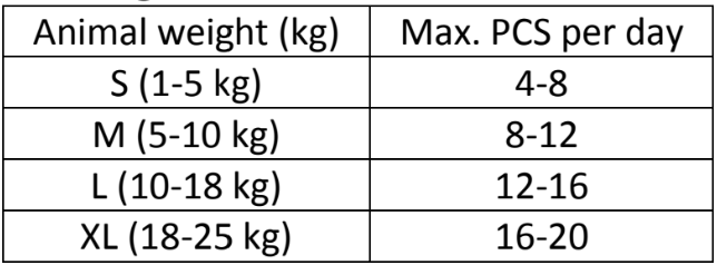 Feeding guide: Snack for reward. Giving your dog a snack as a reward on a regular basis will strengthen your relationship and help develop mutual trust and obedience. Follow the recommended maximum amounts shown in the feeding table